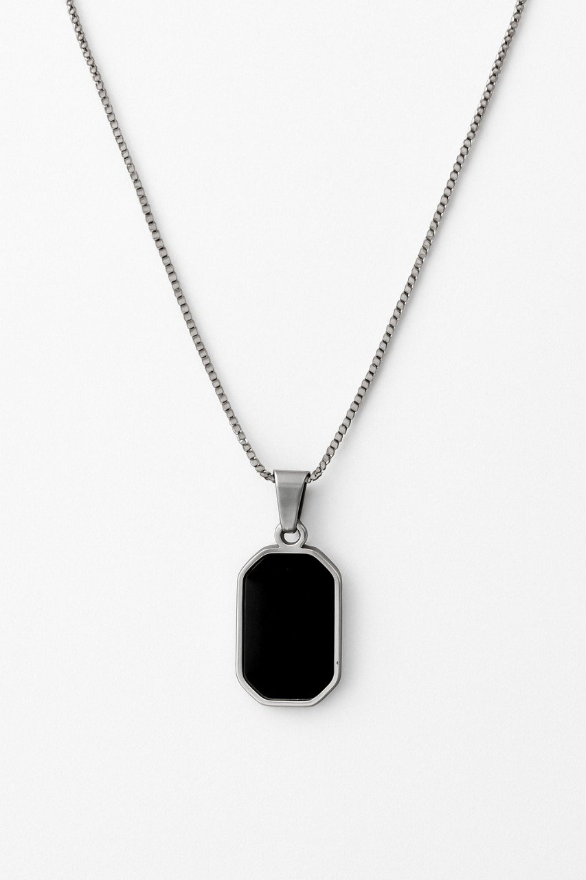 Showcase bold elegance with this stainless steel black pendant necklace. Designed with a sleek rectangular pendant framed in polished silver-tone stainless steel, this piece offers a modern and minimalistic look. The smooth black inlay adds sophistication, making it a versatile accessory that complements both casual and formal outfits. Built with high-quality stainless steel, it ensures long-lasting durability, tarnish resistance, and a timeless shine.