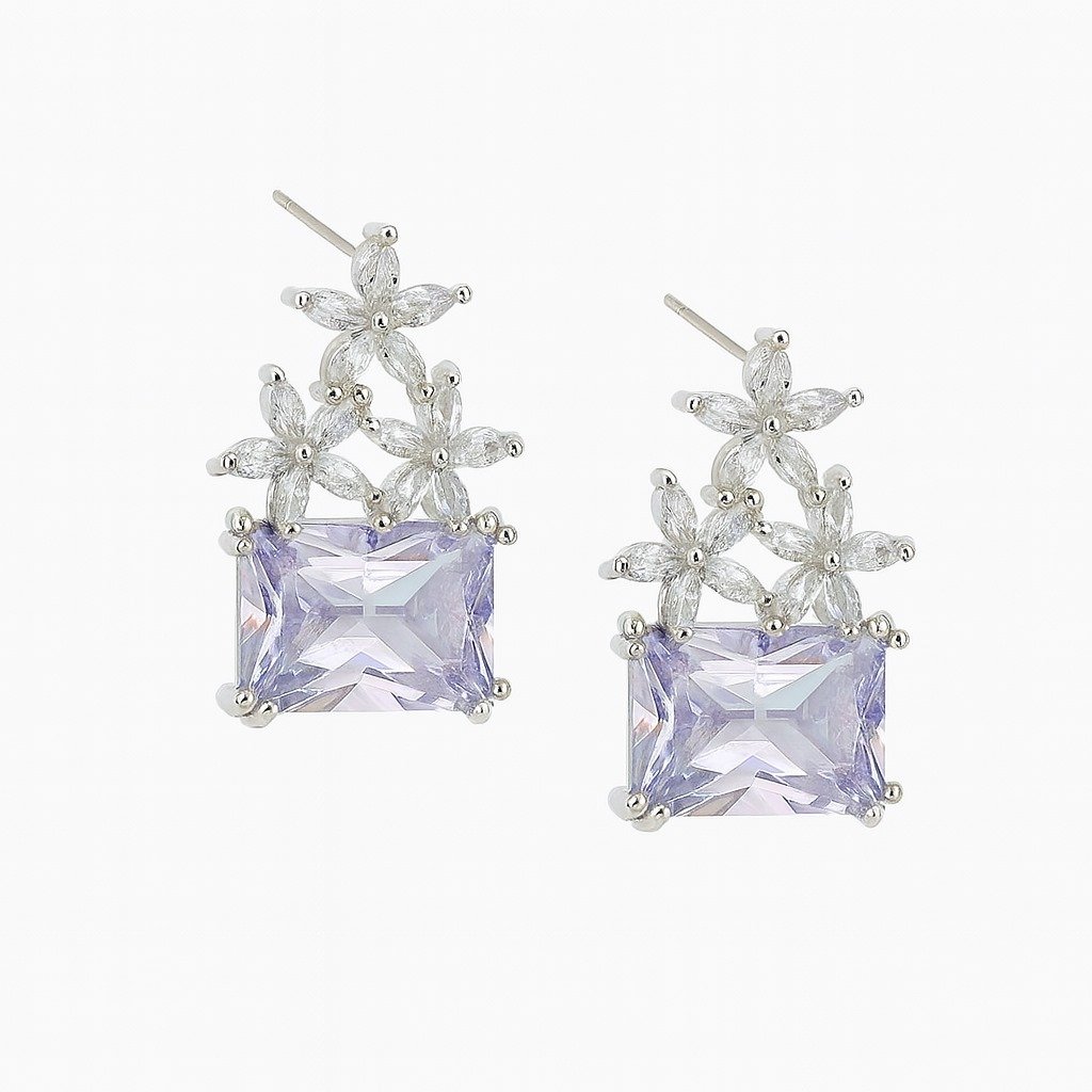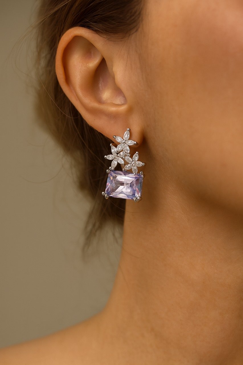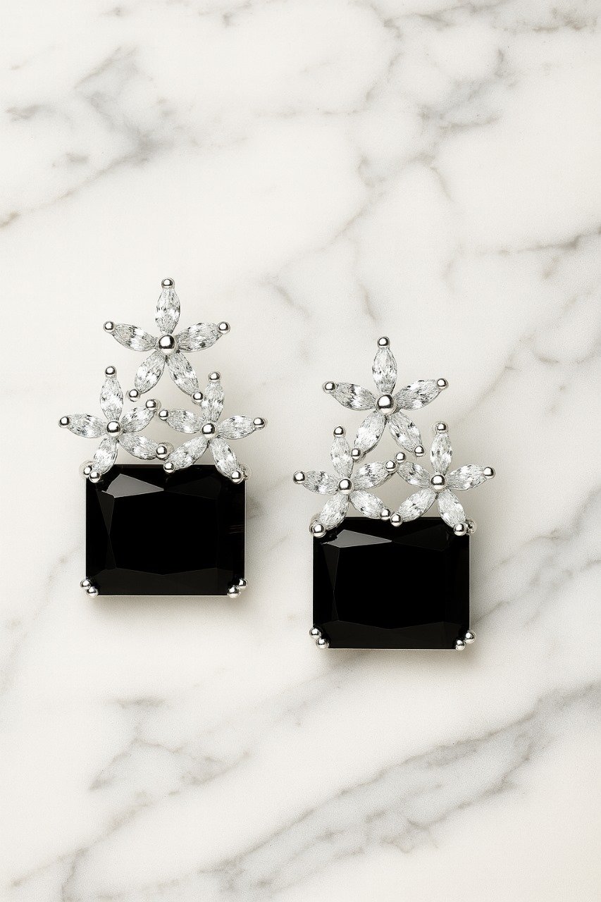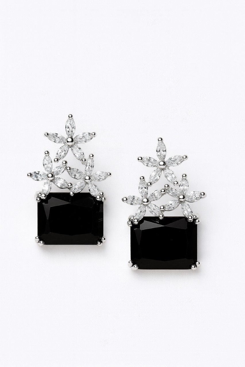 Elegant gemstone earrings with a floral diamond-like top and bold square-cut stone, perfect for evening wear or special occasions.