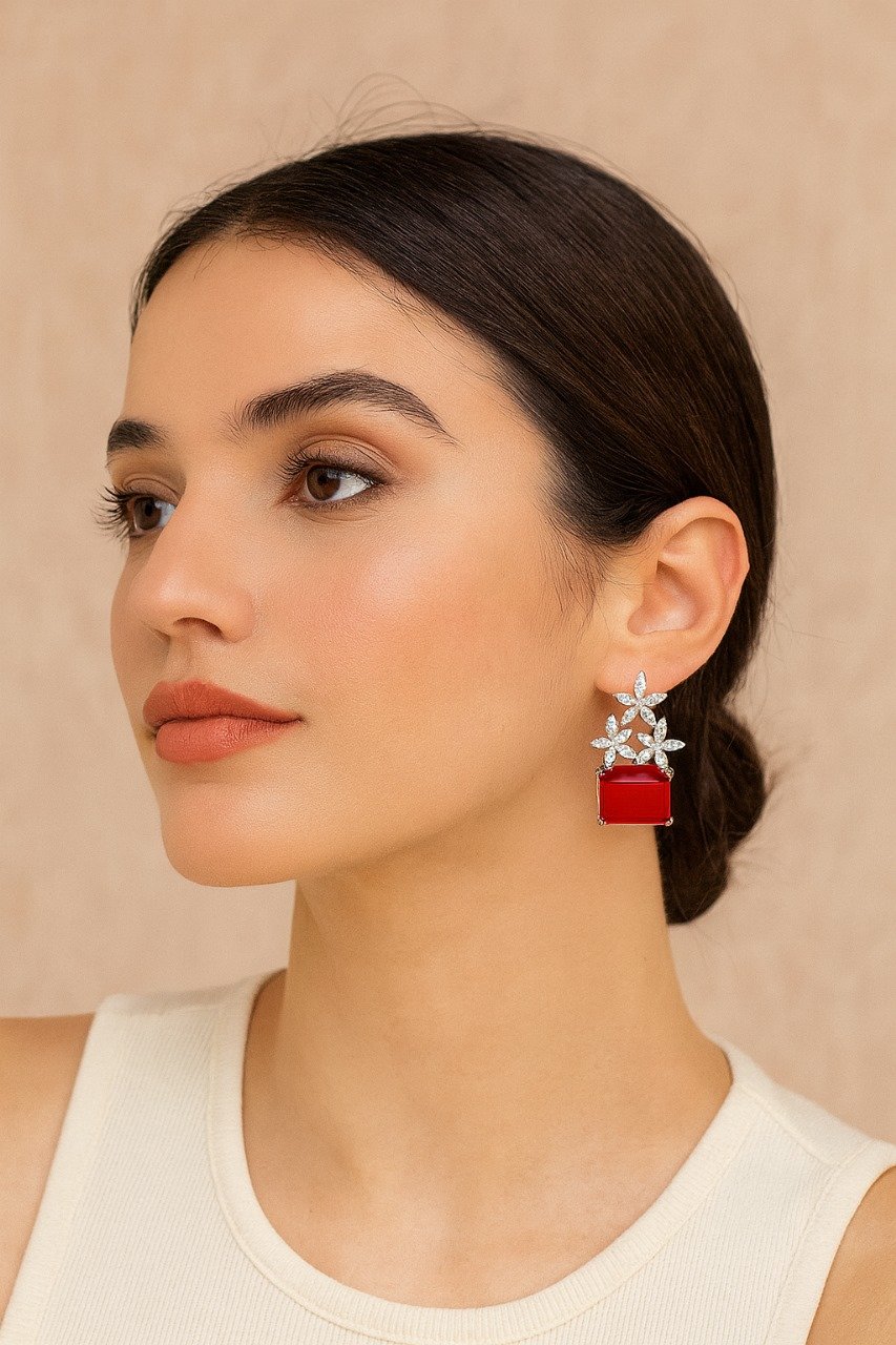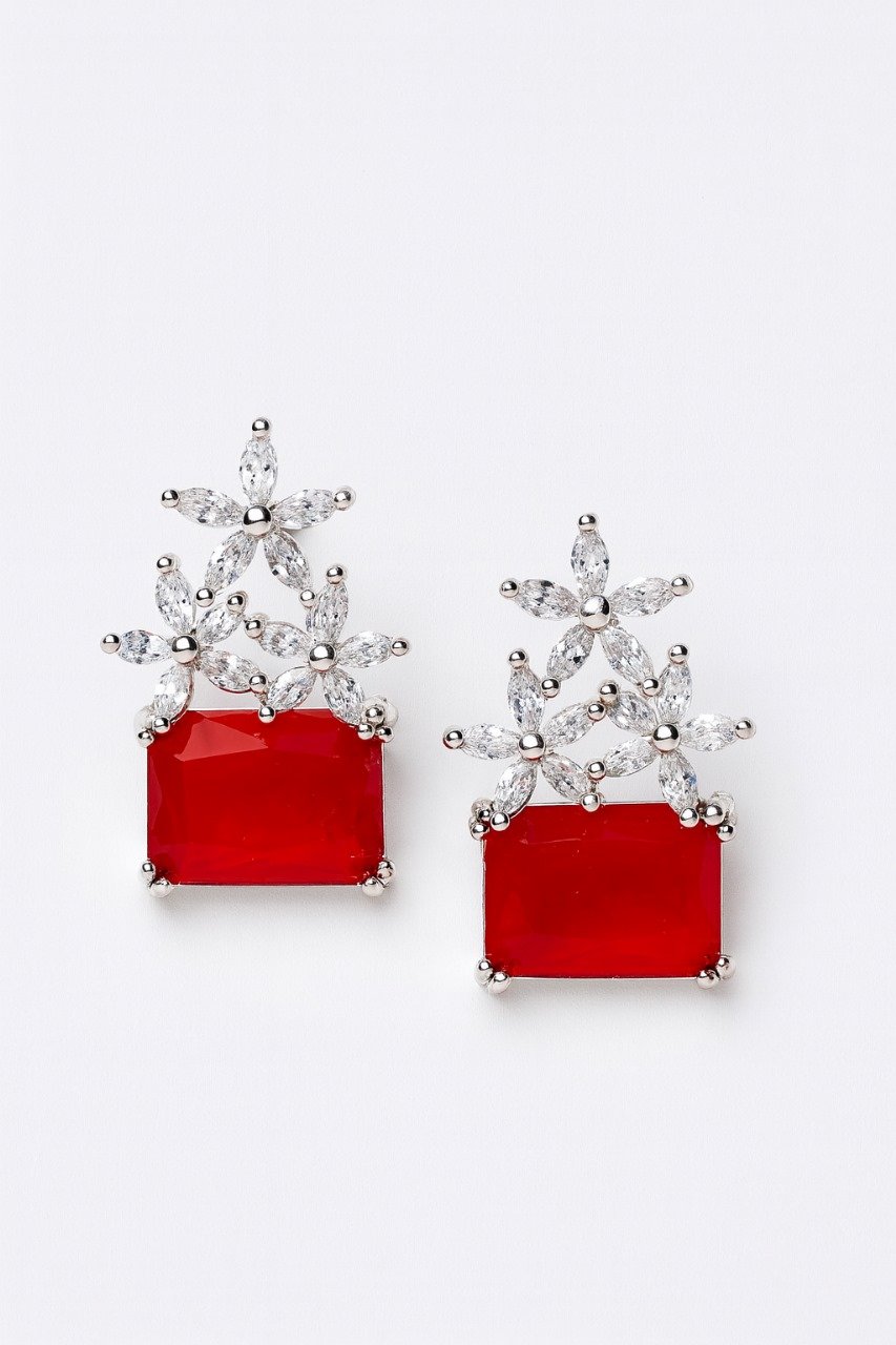 These luxurious earrings feature premium Zarqon stones set in a refined silver-tone base. Designed to make a bold statement, the earrings combine elegance with sparkle — perfect for formal events, weddings, or adding glamour to your evening look. The star-shaped Zarqon clusters beautifully complement the striking central gemstone, available in Red, Black, and Silver, offering versatile styling options.