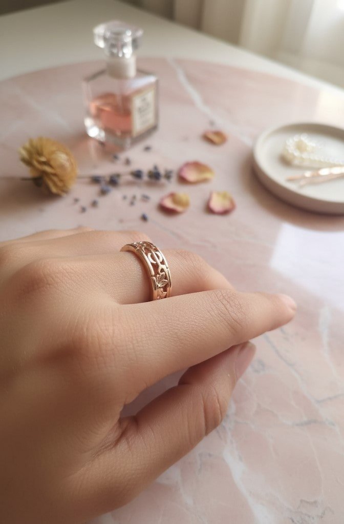 This elegant ring features an intricate floral filigree design crafted in warm rose gold, symbolizing nature’s beauty and timeless grace. Its lightweight yet durable structure makes it perfect for everyday wear while still exuding luxury and charm. Ideal for anniversaries, weddings, or meaningful gifting, this band blends classic artistry with modern sophistication.