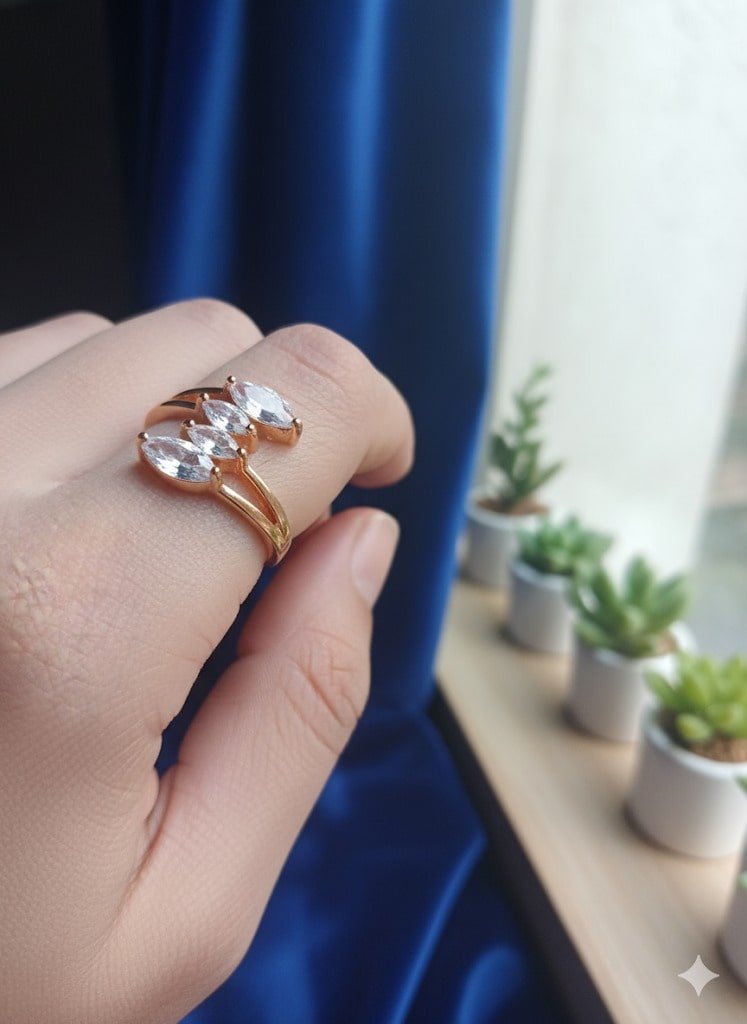 This elegant gold ring showcases three dazzling marquise-cut stones set in a graceful, flowing band design. Crafted from premium gold, its delicate yet bold structure enhances the brilliance of each gemstone, creating a luxurious statement piece. Perfect for engagements, anniversaries, or special occasions, this ring embodies timeless beauty and sophisticated charm, adding sparkle and elegance to any outfit.