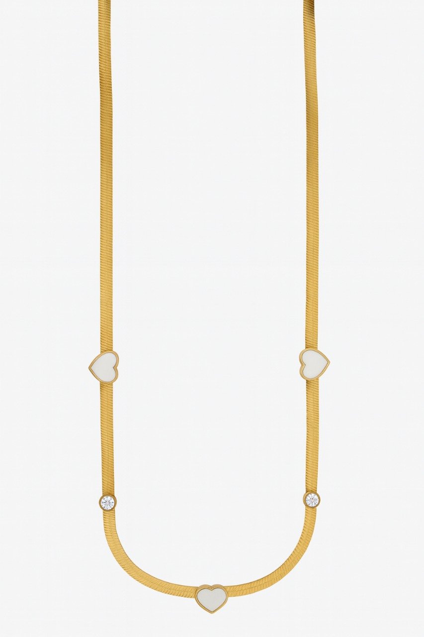 This stylish necklace is crafted from premium stainless steel, ensuring durability, resistance to tarnish, and long-lasting shine. Designed with a sleek snake-chain style, it features delicate heart-shaped motifs with white enamel inlay and sparkling cubic zirconia stones that add a touch of brilliance. Lightweight yet sturdy, it sits comfortably on the neckline, making it perfect for both daily wear and special occasions.