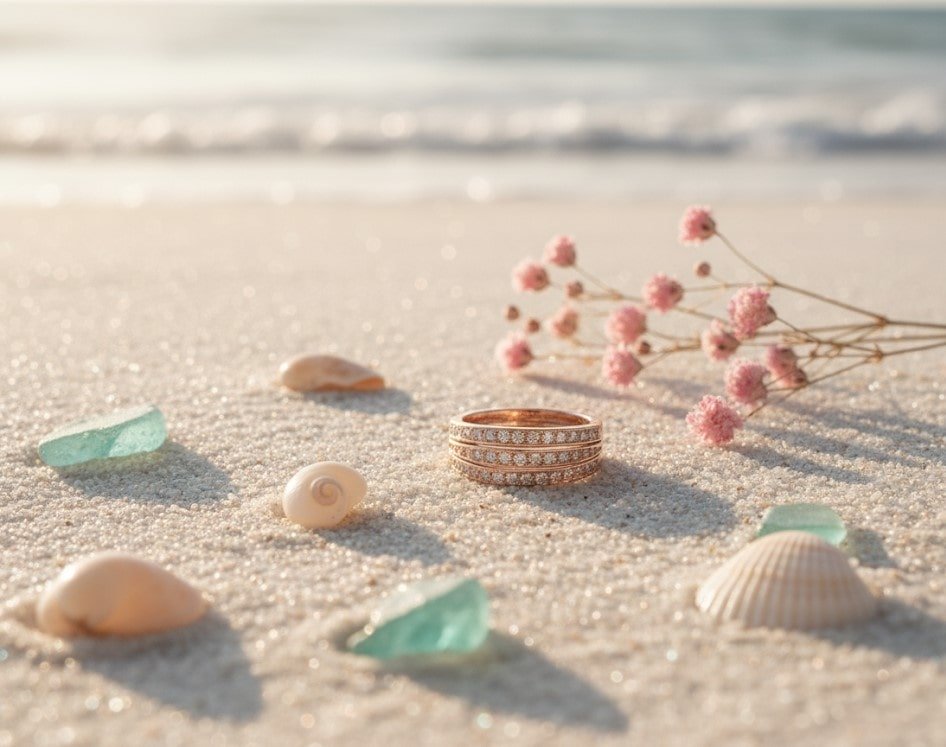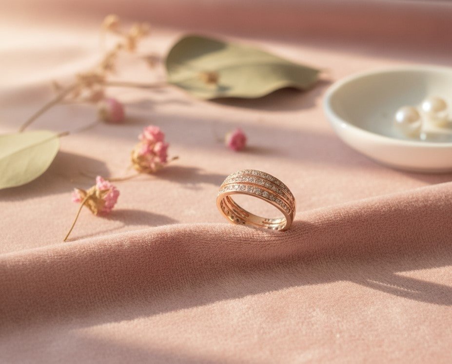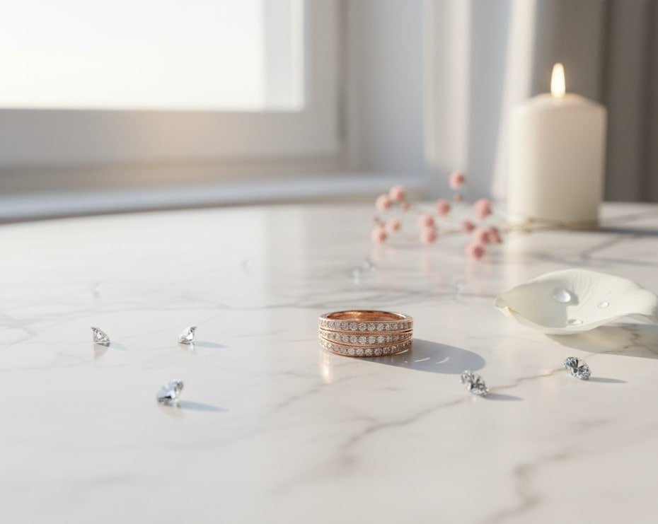 A luxurious triple-row diamond band in rose gold, symbolizing timeless love and refined elegance.
