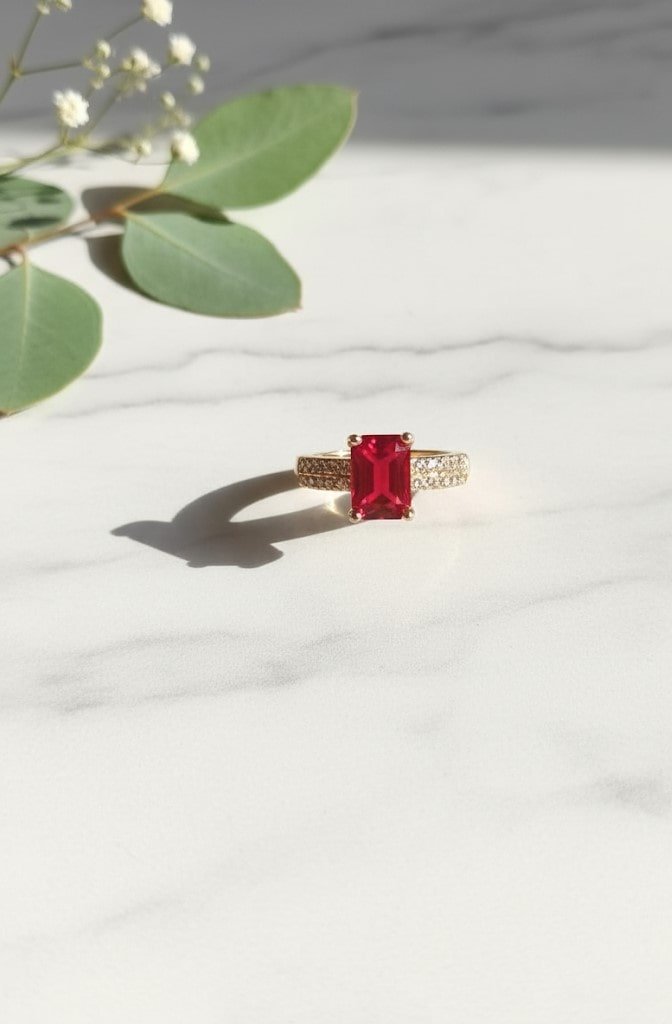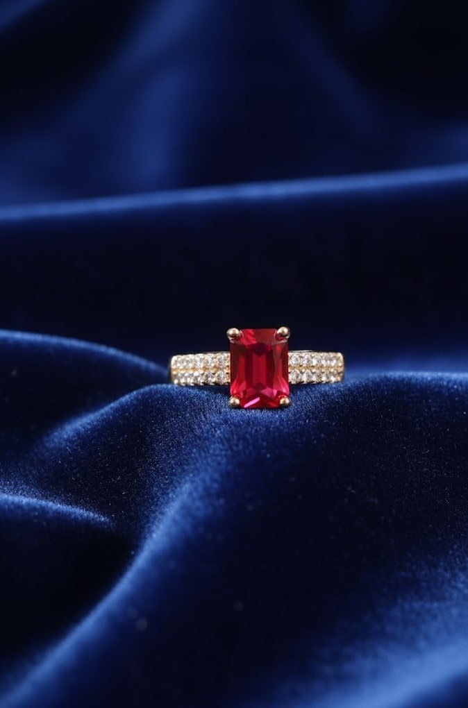 A bold emerald-cut ruby ring with a diamond-studded gold band, exuding passion and timeless luxury.
