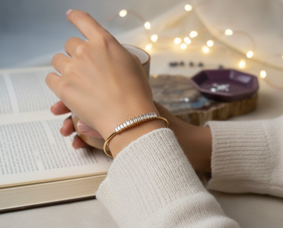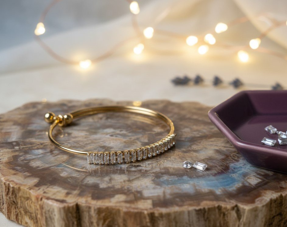 Elevate your elegance with this Gold-Plated Crystal Bangle Bracelet, a perfect balance of sophistication and sparkle. Designed with premium gold plating and embellished with baguette-cut cubic zirconia stones, this bracelet reflects light beautifully and adds a luxurious touch to any outfit. Its sleek, adjustable design ensures comfort and a secure fit, making it suitable for daily wear as well as special occasions.